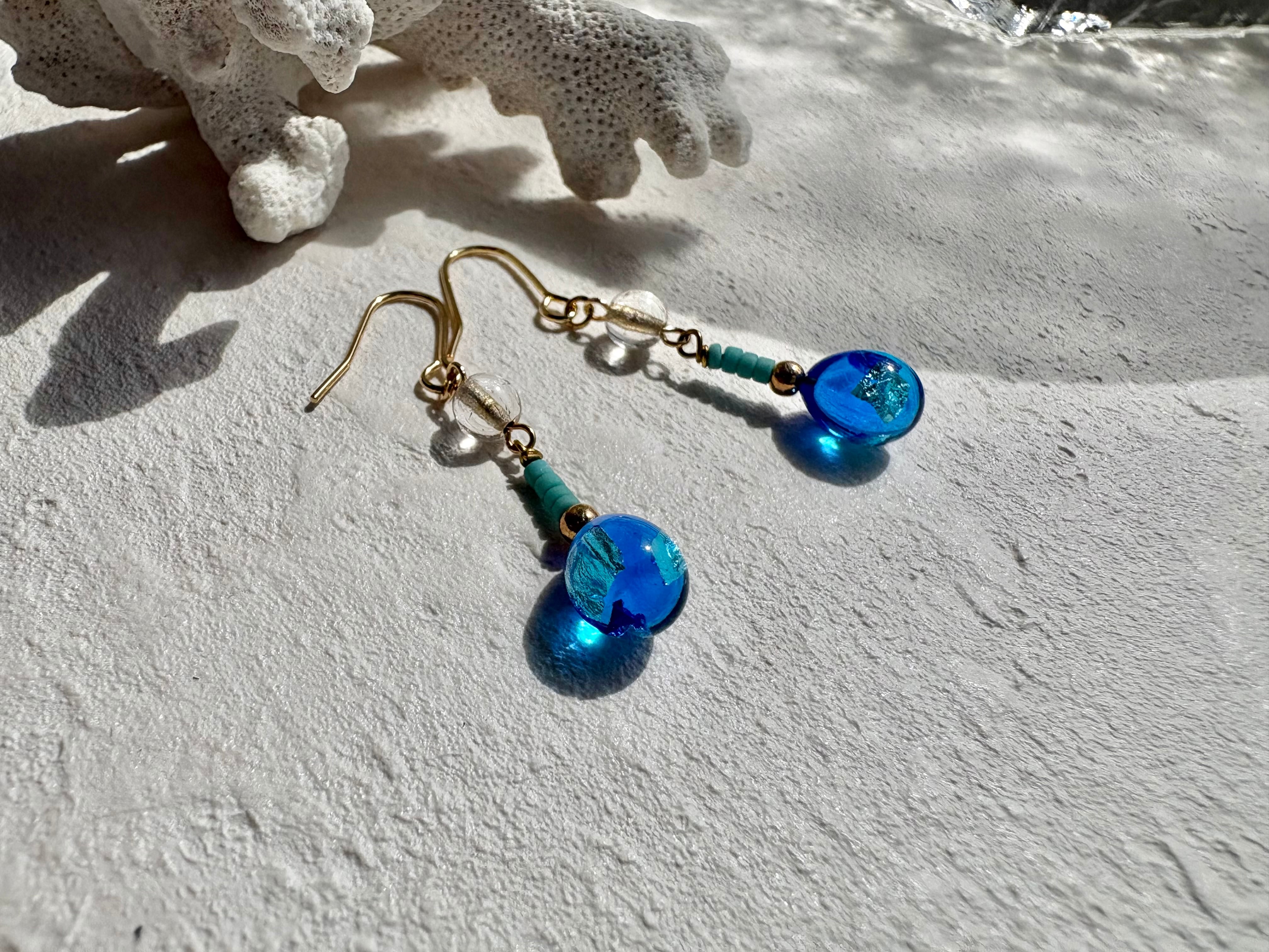 青い海のようなガラスのピアスです。